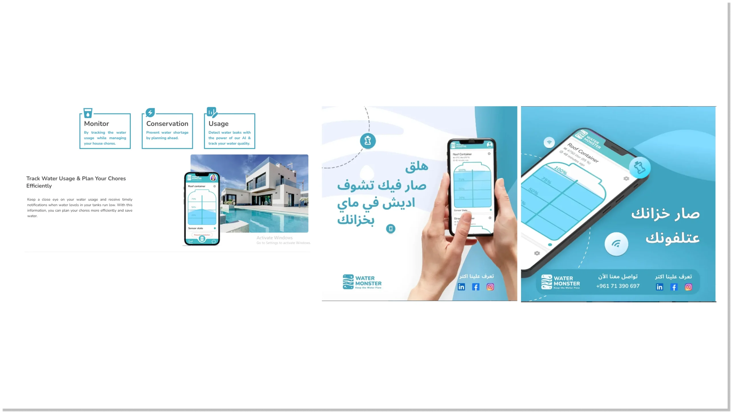 Water Monster, an app focused on efficient water management and conservation. The app offers features to monitor water levels in real time, track usage, and receive low-level alerts, aiming to prevent water shortages and detect leaks using AI technology. It is presented as a solution for both individual and large-scale water management, with collaboration opportunities with governments and NGOs to plan and prevent water shortages.